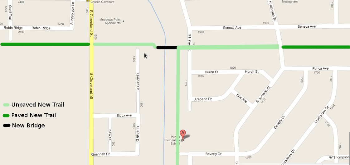 But the best treatment so far is the new bridge near Hayes School. It spans the troublesome drainage channel. There is a pedestrian only bridge just south that was used by people going to Hayes. And I hope it remains. But this new one may replace it.